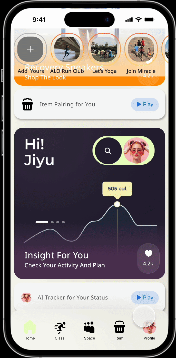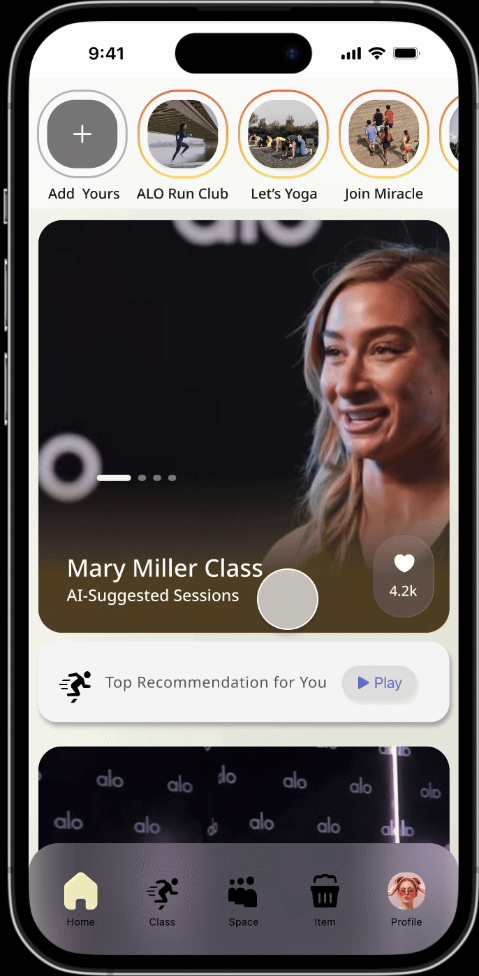 Reimagining Alo’s digital presence as a mobile-first, AI-powered experience that adapts to users’ real-time health and energy states. This concept explores how brand ecosystems can respond dynamically through personalized content, wellness check-ins, and lifestyle integrations.